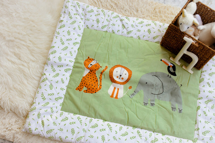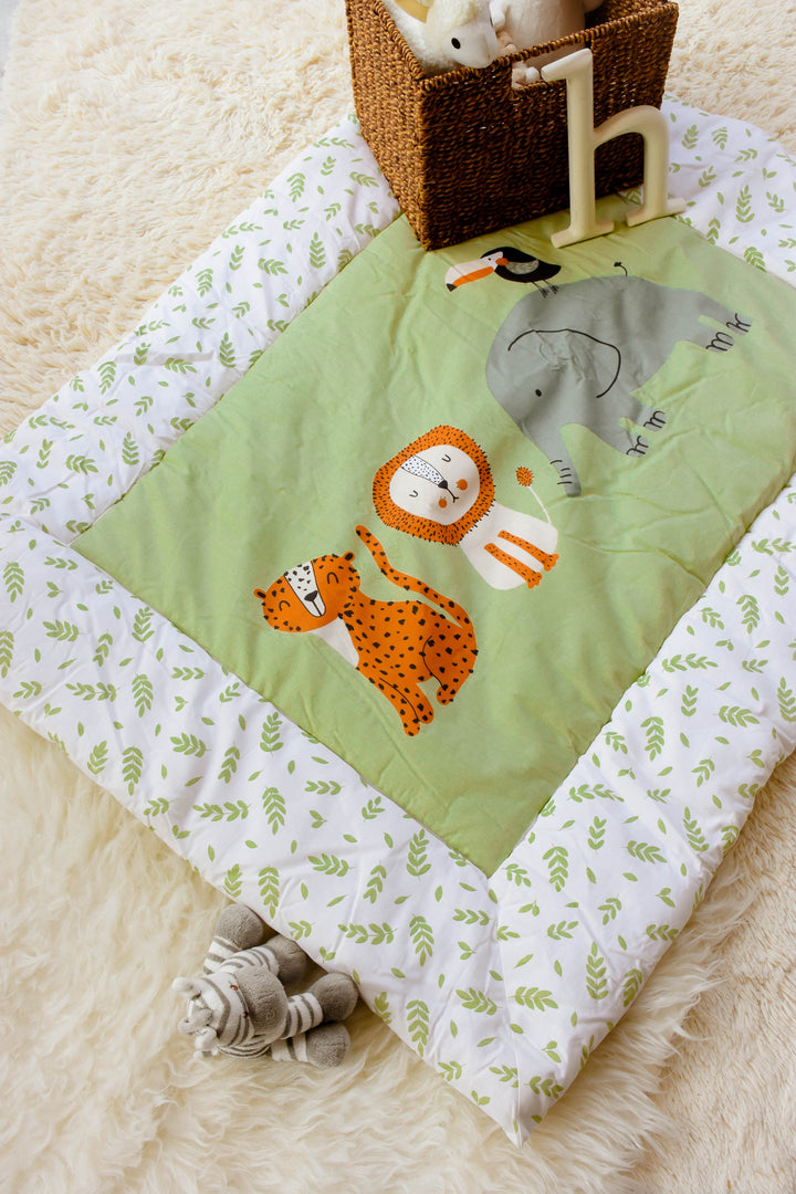 Our safari Playmat in A soothing white and light green patternGender-neutral and perfect for every nursery theme.